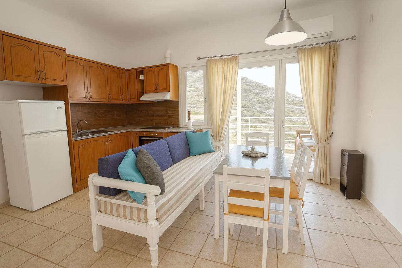 Two-Bedroom Apartment. This air-conditioned apartment comprises 1 living room, 2 separate bedrooms and 1 bathroom with a bath. Guests can make meals in the kitchen that comes with a stovetop, a refrigerator, kitchenware and an oven. Featuring a terrace with sea views, this apartment also provides a washing machine and a flat-screen TV. The unit offers 3 beds.